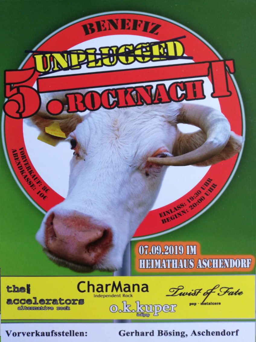In Aschendorf nahe Papenburg steigt am 7. September die 5. Rocknacht. Mit dabei sind The Accelerators, o.k.kuper, Twist of Fate und CharMana. Beginn ist im Heimathaus um 20:00 Uhr.