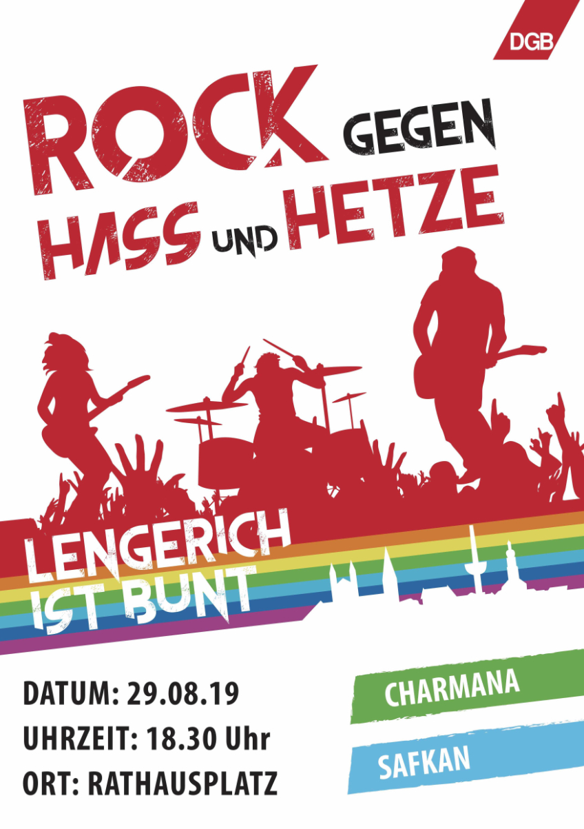 „Als Gewerkschafterinnen und Gewerkschafter setzen wir ein lautstarkes Zeichen gegen den zunehmenden Rechtspopulismus und die Spaltung unserer Gesellschaft, gegen Rassismus und vor allen Dingen gegen rechte Gewalt. Wir laden alle Lengericher Bürgerinnen und Bürger ein, klare Kante zu zeigen und mit uns zu rocken“, freut sich Wilhelm Hügging, Vorsitzender des Ortsverbands.