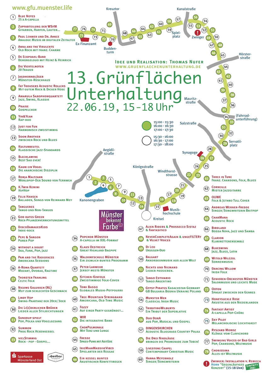 Wir begrüßen euch zur 13. Grünflächenunterhaltung auf Münsters Promende. In diesem Jahr führen wir parallel zu unserer Musik eine Videoaktion mit dem Publikum durch. Jede und jeder, die/der mag, kann den Hut ziehen. Diese Filmschnipsel werden Teil unseres offiziellen Videos zu "Ich zieh den Hut". Kommt herbei und werdet - wenn ihr mögt - Teil des Clips!