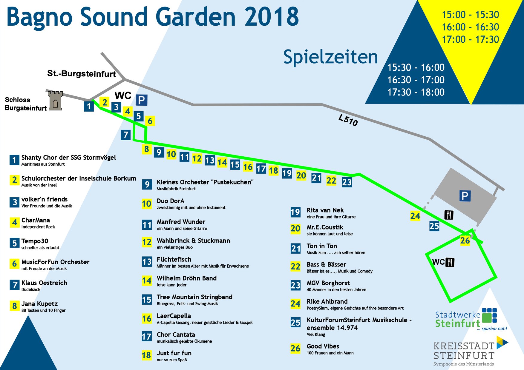 Neben uns gibt es noch 25 weitere Akteure beim Bagno Sound Garden. Im Plan sind alle Spielstätten und -zeiten aufgeführt. So könnt ihr uns immer wieder rechtzeitig vor dem nächsten Spielbeginn wiederfinden. ;-)